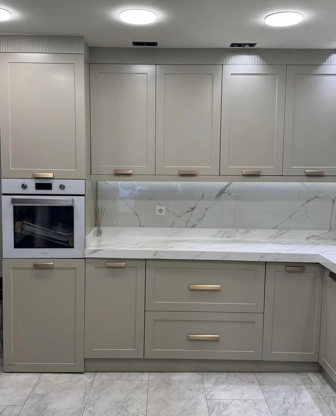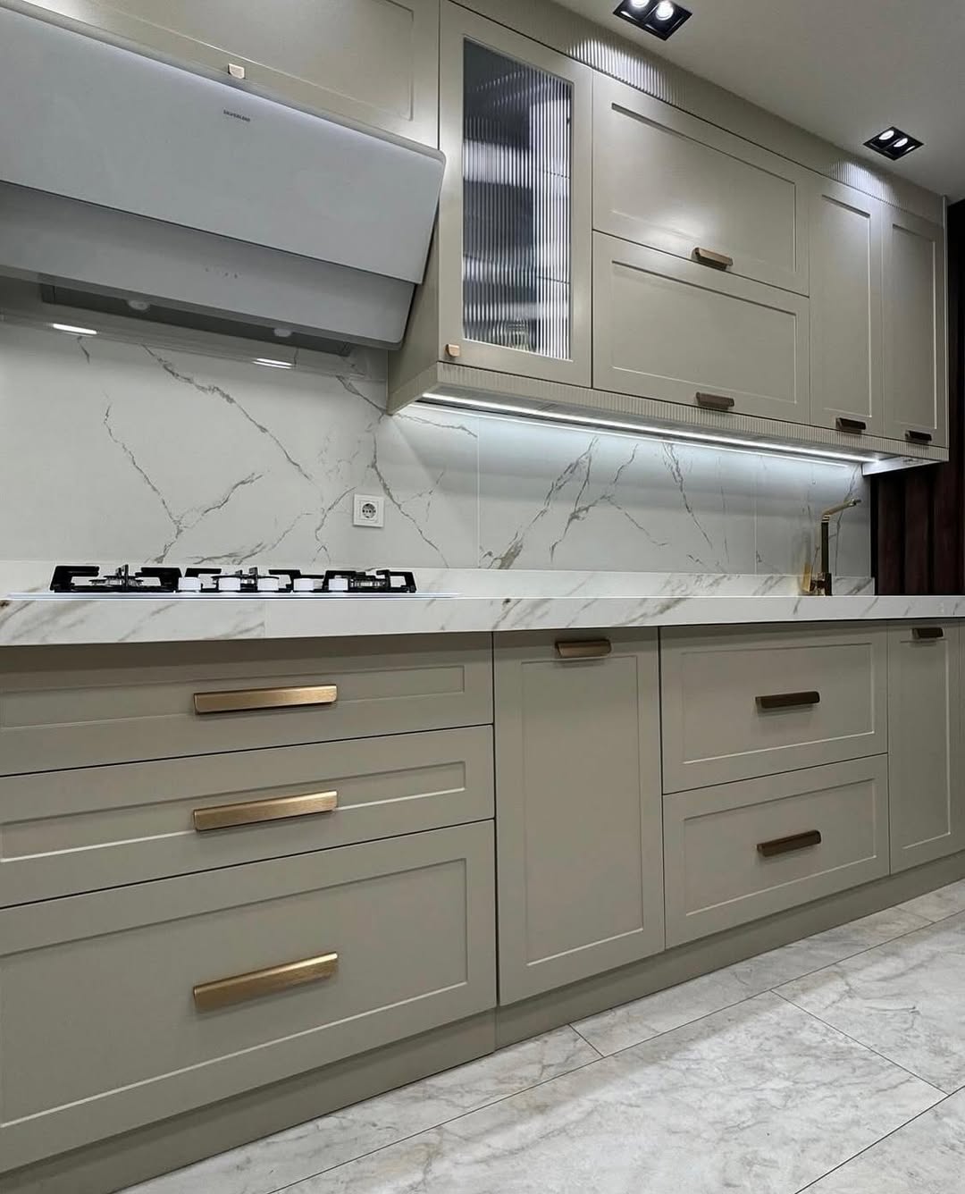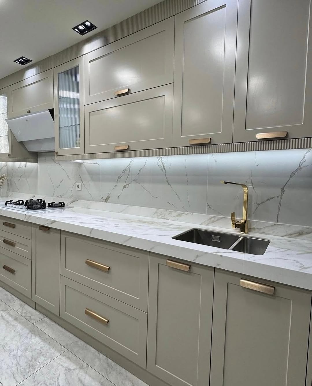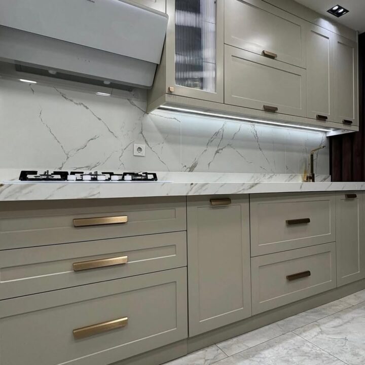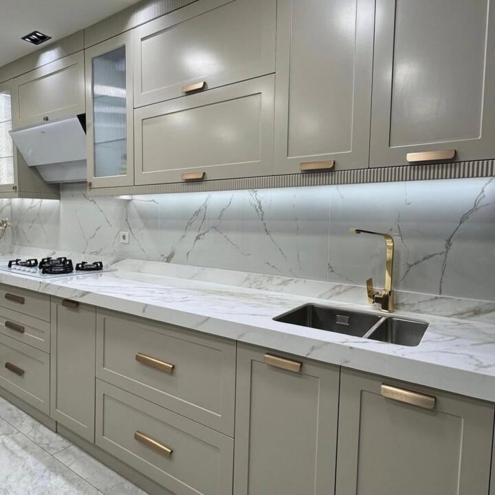 Tasarımın can alıcı noktası olan Calacatta mermer dokulu tezgah ve backsplash (tezgah arası) seçimi, mutfağın genelindeki soft renk paletine doğal bir hareketlilik katıyor. Fırçalanmış altın (brushed gold) kulplar ve batarya tercihlerimiz, mekanın sıcaklığını artırırken; üst dolapların tavan birleşimindeki çıtalı (fluted) geçişler tasarıma mimari bir derinlik kazandırdı. Dolap altı gizli LED aydınlatmalar ise hem çalışma alanında fonksiyonellik sağlıyor hem de mermer dokusundaki damarların zarafetini ön plana çıkarıyor.