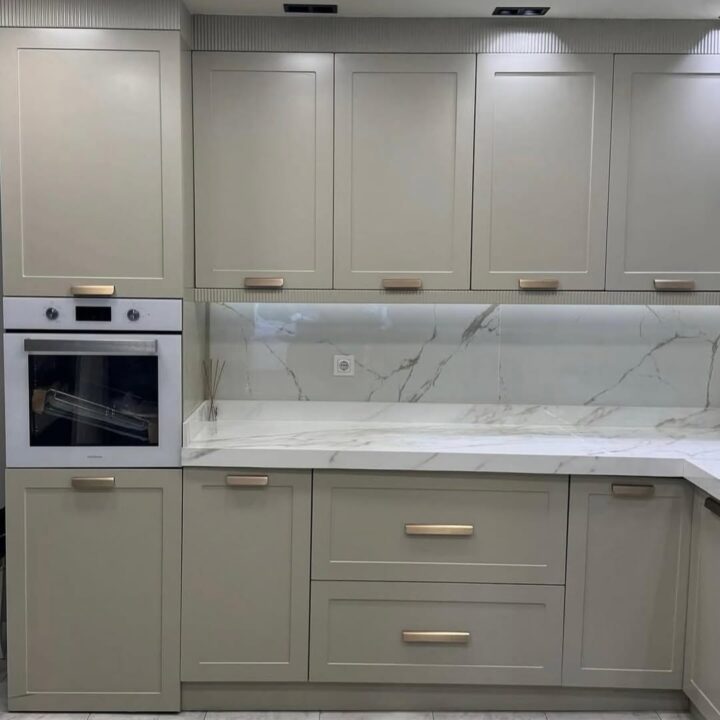 Mutfak, bir evin sadece yemek pişirilen alanı değil, o evin ruhunu yansıtan en önemli yaşam alanıdır. Bu projemizde, klasik Shaker kapak formunu modern “grej” (gri-bej) tonlarıyla harmanlayarak zamansız bir estetik yakaladık. Bursa’nın modern konut projelerine ve yenilikçi mimari dokusuna ilham verecek bu tasarımda, sadeliği lüks detaylarla birleştirerek mekanda sakin ama güçlü bir karakter oluşturduk.